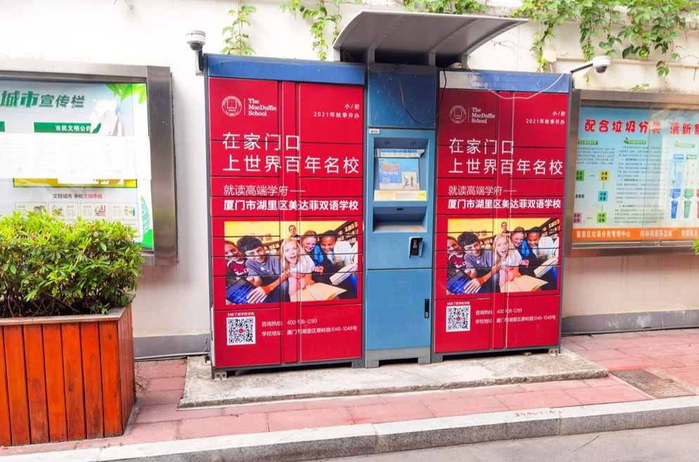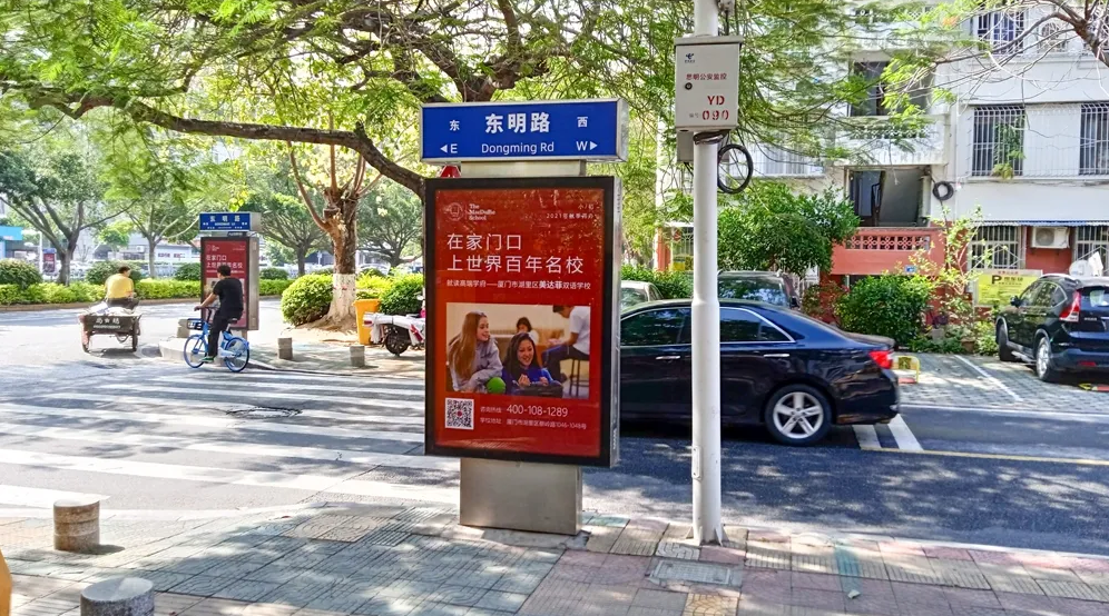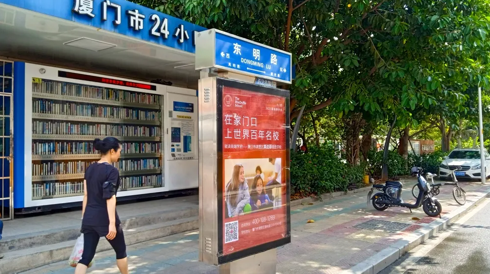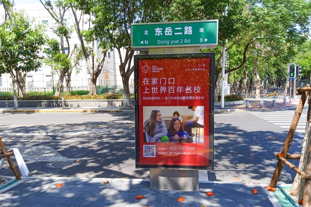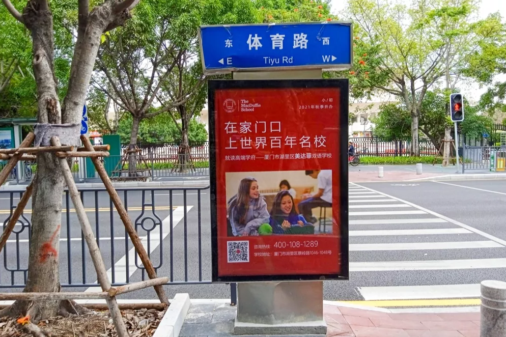 美達(dá)菲在廈門(mén)確定扎根后,重視線上線下的一系列宣傳告知,年后即開(kāi)始在廈門(mén)戶外多個(gè)渠道進(jìn)行大范圍的宣傳推廣,以“在家門(mén)口,上世界百年名校”為口號(hào),集中在五緣灣、觀音山、會(huì)展、萬(wàn)達(dá)廣場(chǎng)、蔡塘廣場(chǎng)等多個(gè)中高端商圈、商務(wù)圈,以及仙岳路、廈禾路、嘉禾路等多個(gè)主干道進(jìn)行城市路名牌的投放,同時(shí)在島內(nèi)多個(gè)高端住宅小區(qū)的快遞柜進(jìn)行大幅畫(huà)面展示。