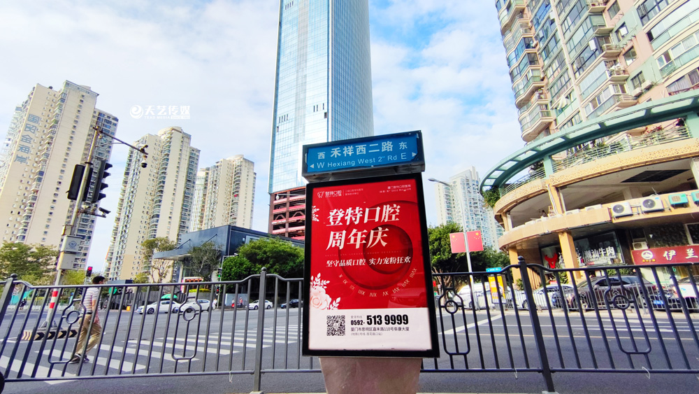 同時(shí),廈門(mén)登特口腔繼續(xù)與廈門(mén)天藝傳媒合作,投放鷺島全城超200座城市路名牌,覆蓋島內(nèi)各大交通主干道(如嘉禾路、禾祥西路、禾祥東路)、核心商圈、商務(wù)區(qū)寫(xiě)字樓林立區(qū)、人流車(chē)流覆蓋密集區(qū)域。